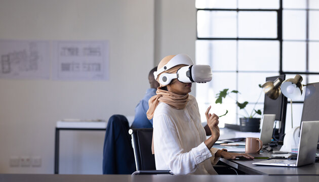 Metaverse digital cyber world technology, woman with virtual reality VR goggles playing augmented reality game, futuristic lifestyle