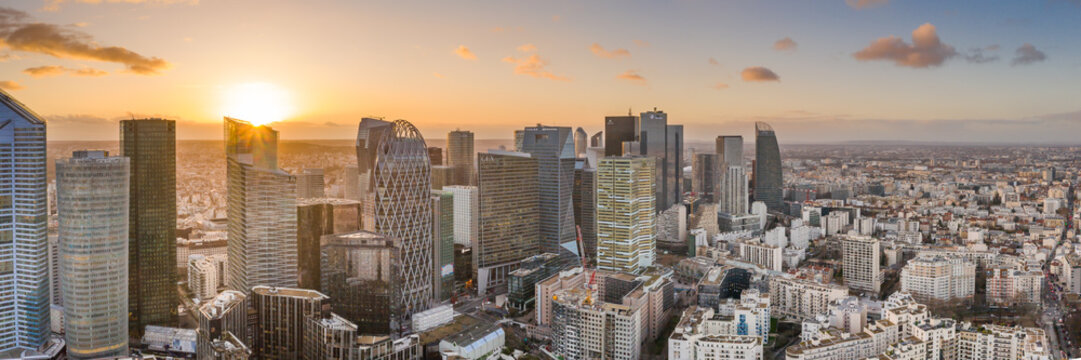 Aerial pano drone shot of La Defense skyscraper complex during sunset hours