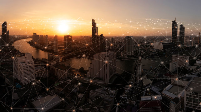 Cityscape with connecting dot technology of smart city conceptual