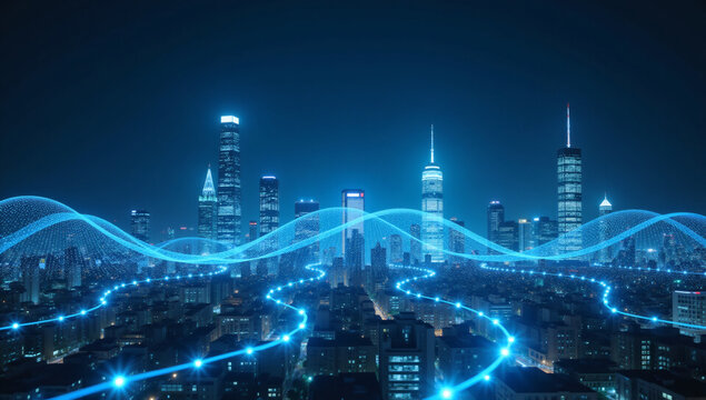 A futuristic cityscape with glowing digital lines and icons, representing the concept of a smart city and technological advancement.