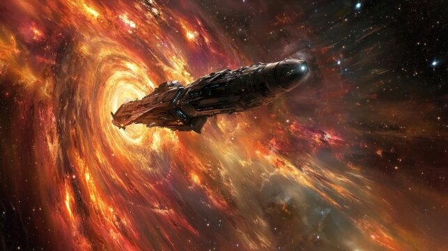 Futuristic spacecraft navigating through a vibrant cosmic vortex.
