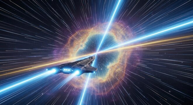 A futuristic spacecraft navigates a vibrant cosmic vortex, showcasing a dazzling display of light streaks and nebulae.