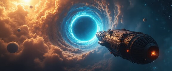 Spaceship navigating through a vibrant cosmic wormhole in space, surrounded by nebulae and distant planets