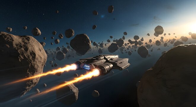 Futuristic Spacecraft Navigating Through Asteroid Field in Deep Space with Thrusters Ignited