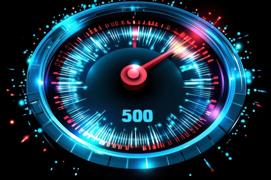 A high-tech speedometer indicating a reading of 500, with glowing blue and red accents, representing high speed and advanced technology.