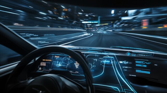 empty cockpit of vehicle night view, HUD(Head Up Display) and digital speedometer, autonomous car