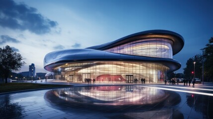 A futuristic sports stadium with autonomous seating and fully immersive VR sections featuring a sleek high tech interior design with geometric patterns curves and vibrant blue lighting