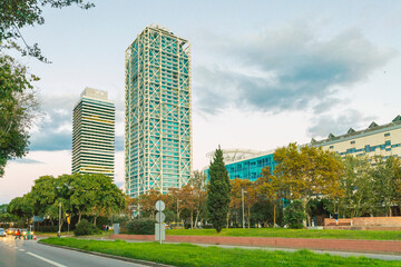 Modern skyscrapers on Park Placa dels Voluntaris Olimpics, Barcelona, Catalonia, Spain