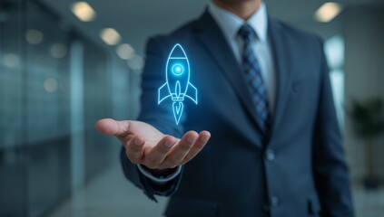Man Touching Futuristic Digital Interface with Glowing Icon.