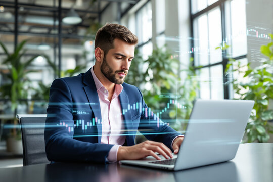 Businessman in formal suit working on laptop with digital financial graphs overlay, modern office background, concept of data analysis and design. Ai generative