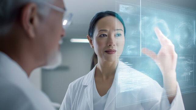Female doctor examining digital medical scan on a transparent futuristic touchscreen with a colleague.