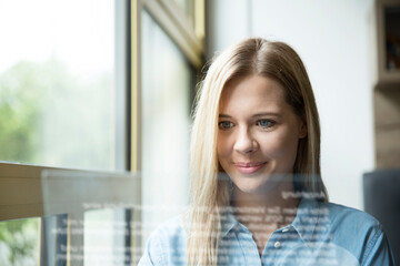 Businesswoman using futuristic tablet, glass pane