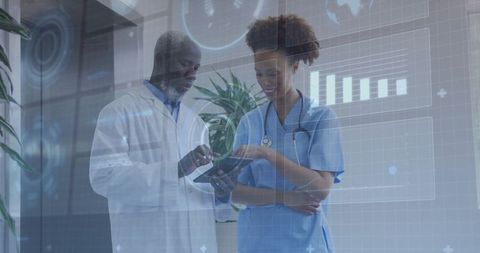 Doctor and nurse discussing with digital tablet in futuristic clinic