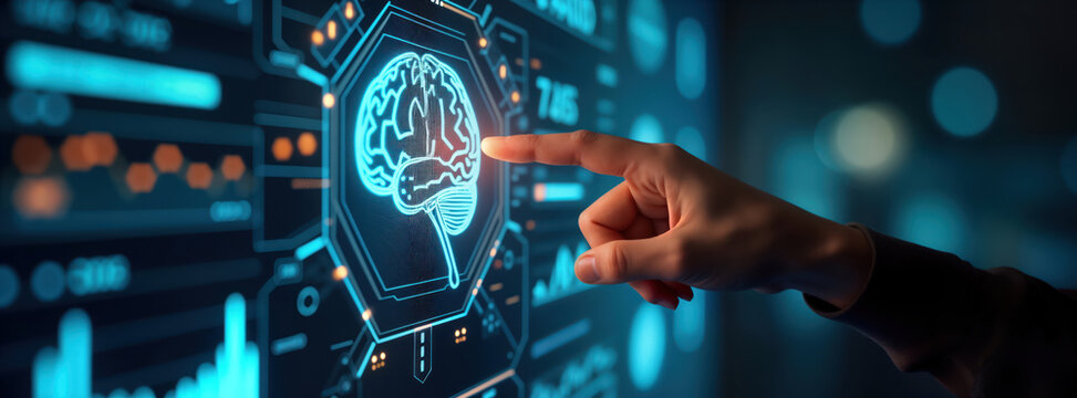Person interacts with virtual screen displaying brain icon. Data analysis, AI tech depicted on dark background with vibrant light. Visual representation of programmer working with digital tech,