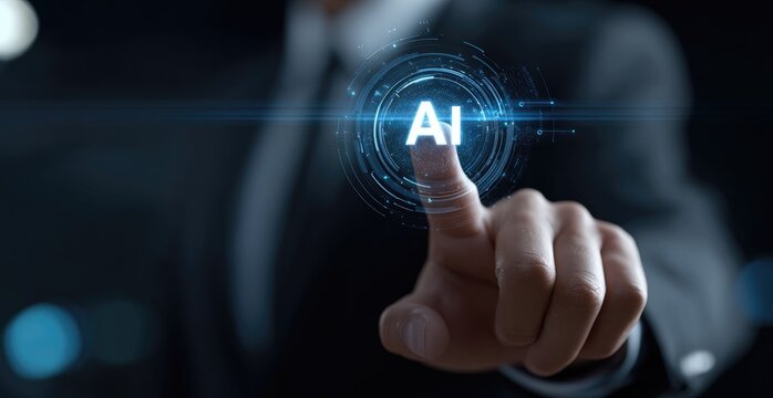 Businessman interacts with a holographic AI interface