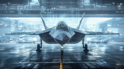 Stealth fighter jet in hangar with digital interface.
