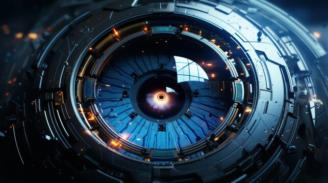 blue concentric digital interface with neon circuit lines and orange data nodes on a dark background, sleek futuristic and precise mood