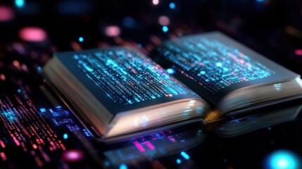 Open Book with Glowing Text and Abstract Light Particles in a Digital Environment