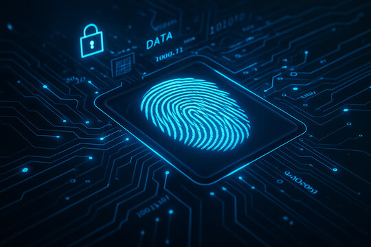 Digital fingerprint scan on high-tech interface for cybersecurity