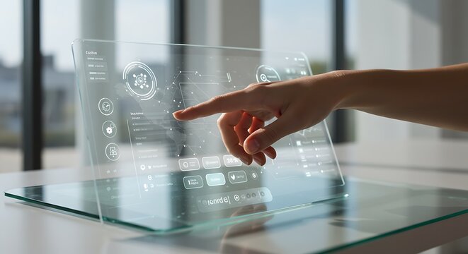 A hand interacting with a holographic interface, showcasing modern technology and futuristic concepts