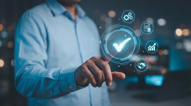 a man in a blue shirt interacts with a holographic display of digital icons representing data and verification processes in a blurred background