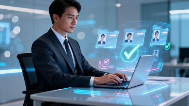 Business professional using laptop with digital interface in modern office