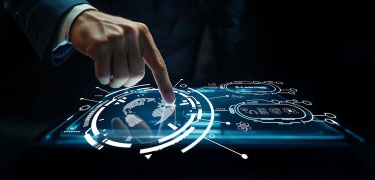 Business professional using futuristic technology on a digital touchscreen interface for global data analysis and smart solutions in a dark environment