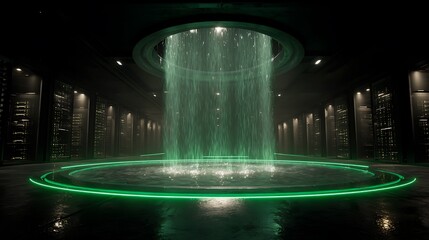 Abstract luminous waterfall with concentric ripples on dark background creates immersive visual