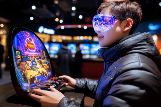 Person using futuristic technology to experience old video games, with a holographic retro console and gamepad that brings the classics of yesterday to life in a new way