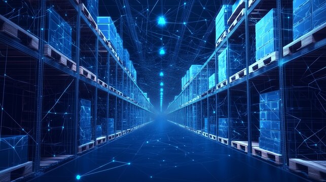 Abstract Real-Time Logistics Tracking Dashboards in Warehouses, Featuring Low Poly Wireframe Design, Glowing Particles, and Futuristic Lines on a Dark Blue Background.