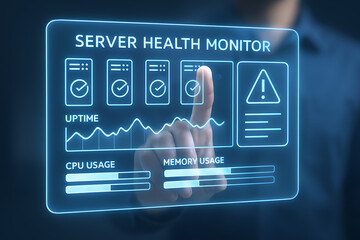 A person interacting with a futuristic server health monitor interface with uptime and usage graphs shown