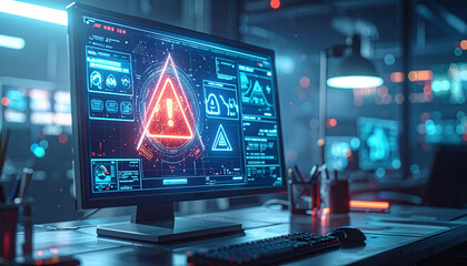 Cybersecurity Alert System with Red Warning Triangle on Computer Screen in Dark Office