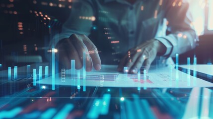 Business professional analyzing data on tablet with holographic data overlay, modern technology and data analysis