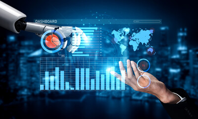 A futuristic scene showing a robot hand engaging with digital data visualizations on a dashboard, representing innovation in technology and analytics. Impute