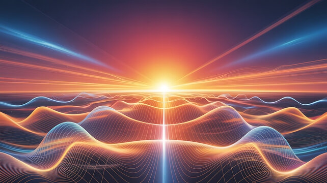 Abstract digital landscape of glowing wireframe waves leading to bright horizon sun with orange and blue light effects creating conceptual data visualization and futuristic technology background art