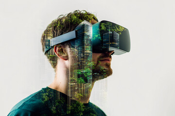 Double exposure image of a man with VR headset, futuristic virtual reality technology and digital innovation.