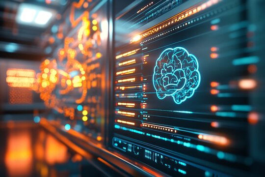 A large sci-fi themed digital display shows a chatbot interface with an abstract brain icon in blue. In the background, a futuristic server room with glowing data cables and technology infrastructure