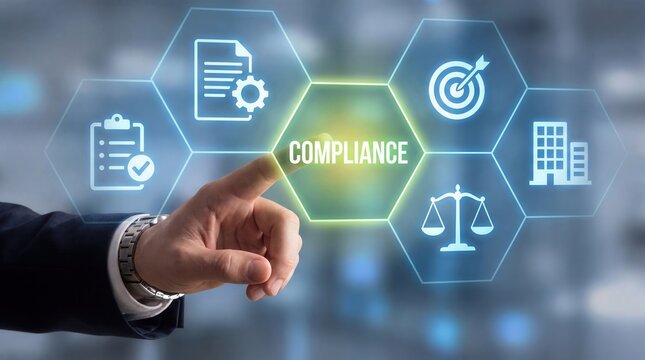 A professional hand with a suit and watch touches a glowing compliance hexagon in a futuristic digital interface surrounded by various regulatory business and legal icons