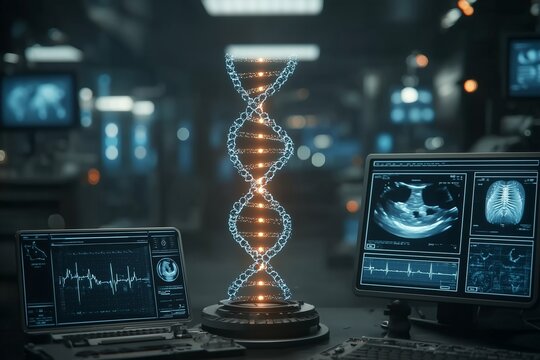 Futuristic digital interface with dna helix overlays
