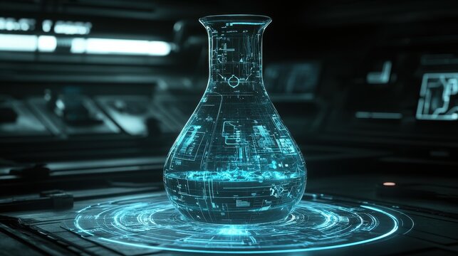 Futuristic flask with holographic data overlay.