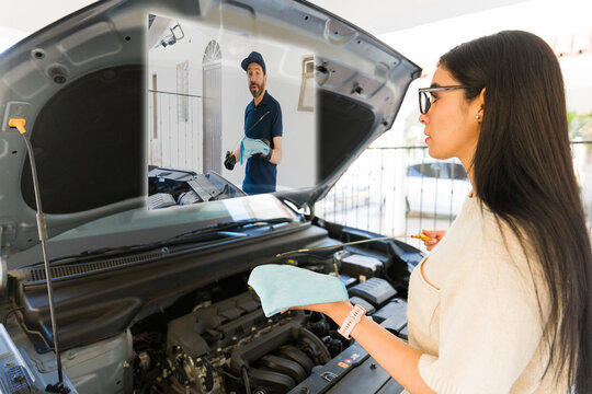 Latin woman wearing AR glasses, receiving remote mechanic guidance while checking car's oil level in workshop setting