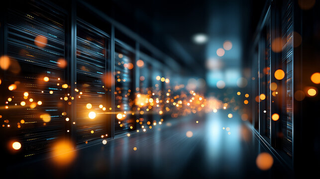 Glowing orange light particles floating in dark server room corridor, illuminated data center equipment, technology visualization, cloud computing, defocused background, with copy