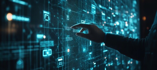 Futuristic touchscreen interface interaction showing digital control panels, cybersecurity systems, and advanced technology at user’s fingertip