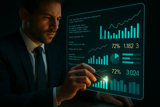 Businessman interacting with futuristic digital financial data display screen analyzing growth