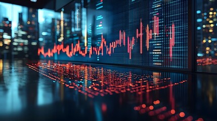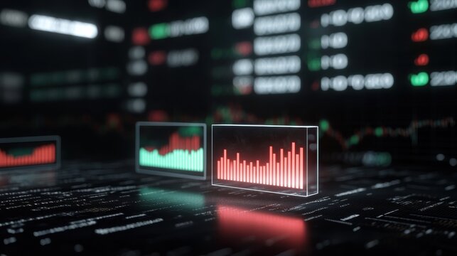 Abstract digital stock market data visualization with glowing red and green charts. Close-up view of a futuristic trading floor with glowing digital screens displaying stock market fluctuations.
