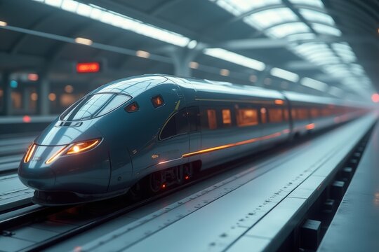 Futuristic high-speed train at a modern station with motion blur and neon lights for transportation design.