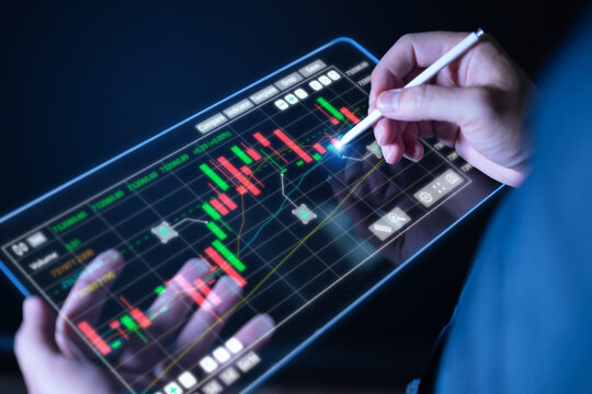 Businessman watching stock chart with ups and downs, business fluctuations, market growth as value fluctuates with inflation and financial crisis from modern transparent tablet.