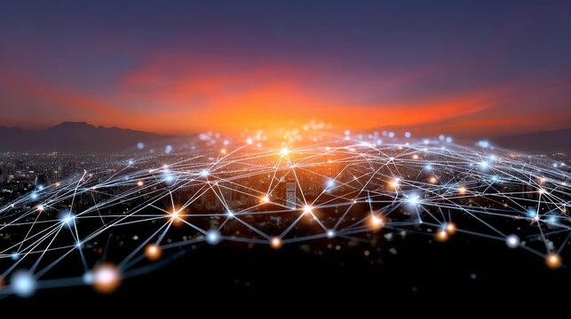 Cityscape with a network of lines connecting the buildings. The sky is orange and the sun is setting