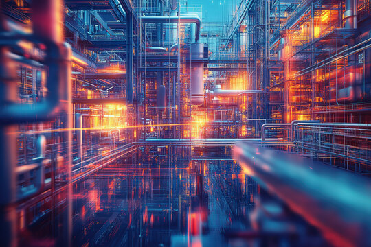 A futuristic industrial scene featuring intricate pipes and glowing lights, showcasing advanced technology in a vibrant, illuminated environment.
