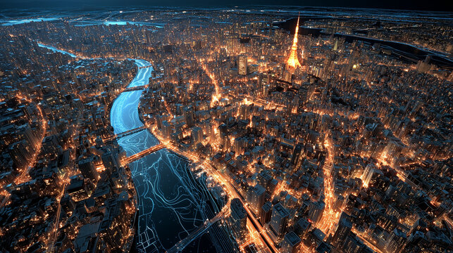 A perfect, glowing 1:1 digital twin replica of Tokyo at night, visualizing real-time data streams.
